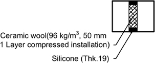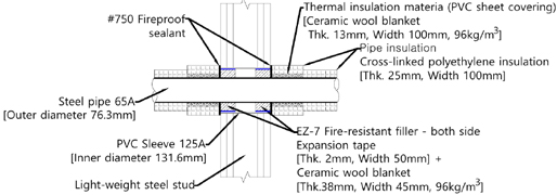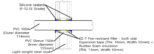 금속관 관통부는 Table 1에서와 같이 두 겹의 내화 채움재를 배관 관통부 양쪽에 설치한 다음 방화 실란트로 마감한다. 금속관 관통부 시공 단계별 주파수 대역별 공기전달음 차단성능을 비교하기 위해 관통부에 배관만 설치한 경우, 내화 채움재 한겹, 두겹을 단계적으로 적용하여 측정하였다. 마지막으로 방화 실란트까지 적용하여 측정하였다. 공기전달음 측정시 약 80 cm 길이 배관을 사용하였다. 배관을 통한 공기전달음 전달을 방지하기 위해 금속관 내부는 세라믹울로 배관 안쪽을 모두 충전한 다음 배관 양쪽 끝단은 직물로 마감하여 사용하였다.